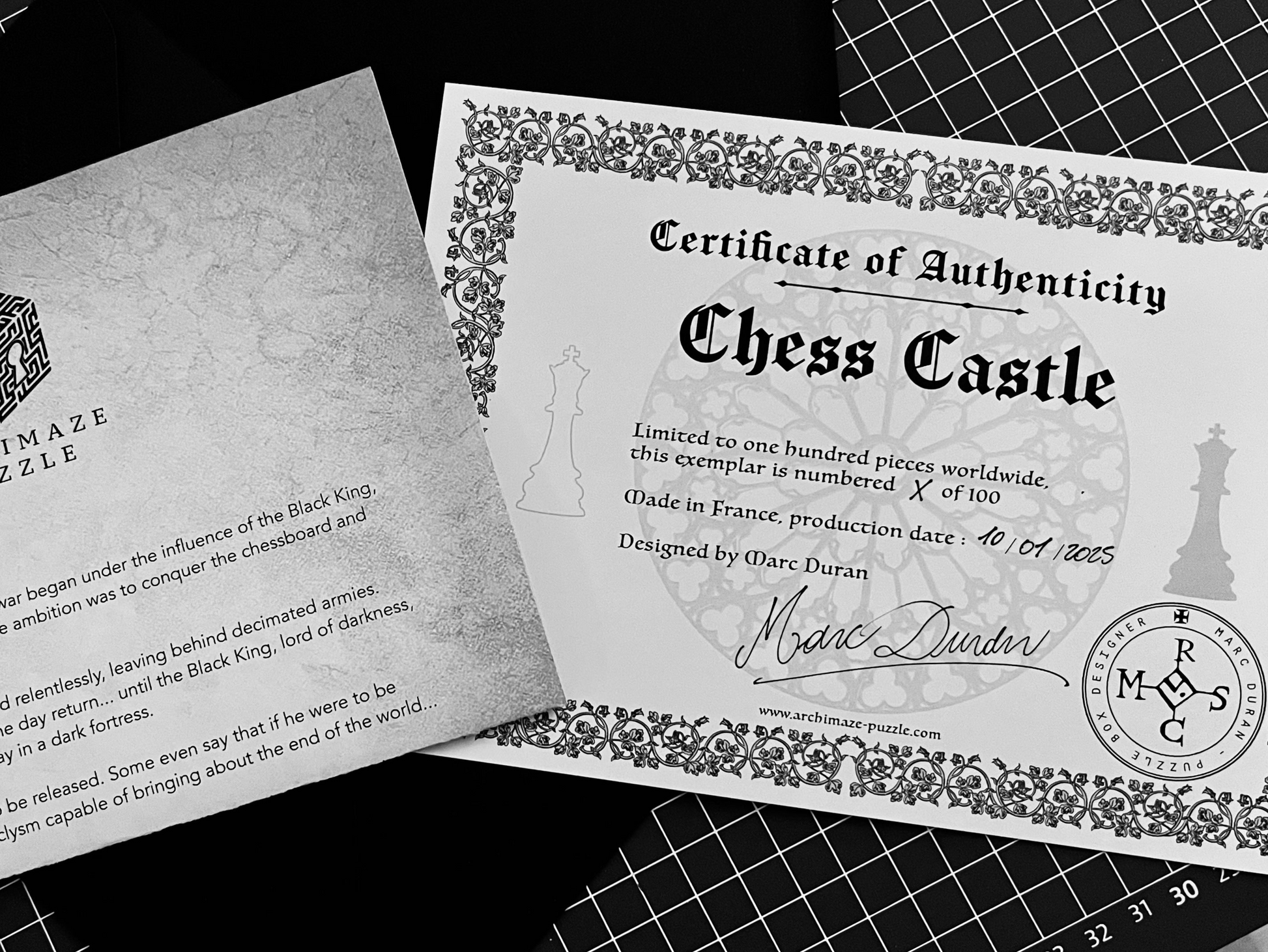Important: Chess Castle contains puzzles written in English or French. The default language will be English for countries other than France. If you would like to choose French instead of English, or vice versa, please let us know by email at the following address, specifying your order number: contact@archimaze-puzzle.com